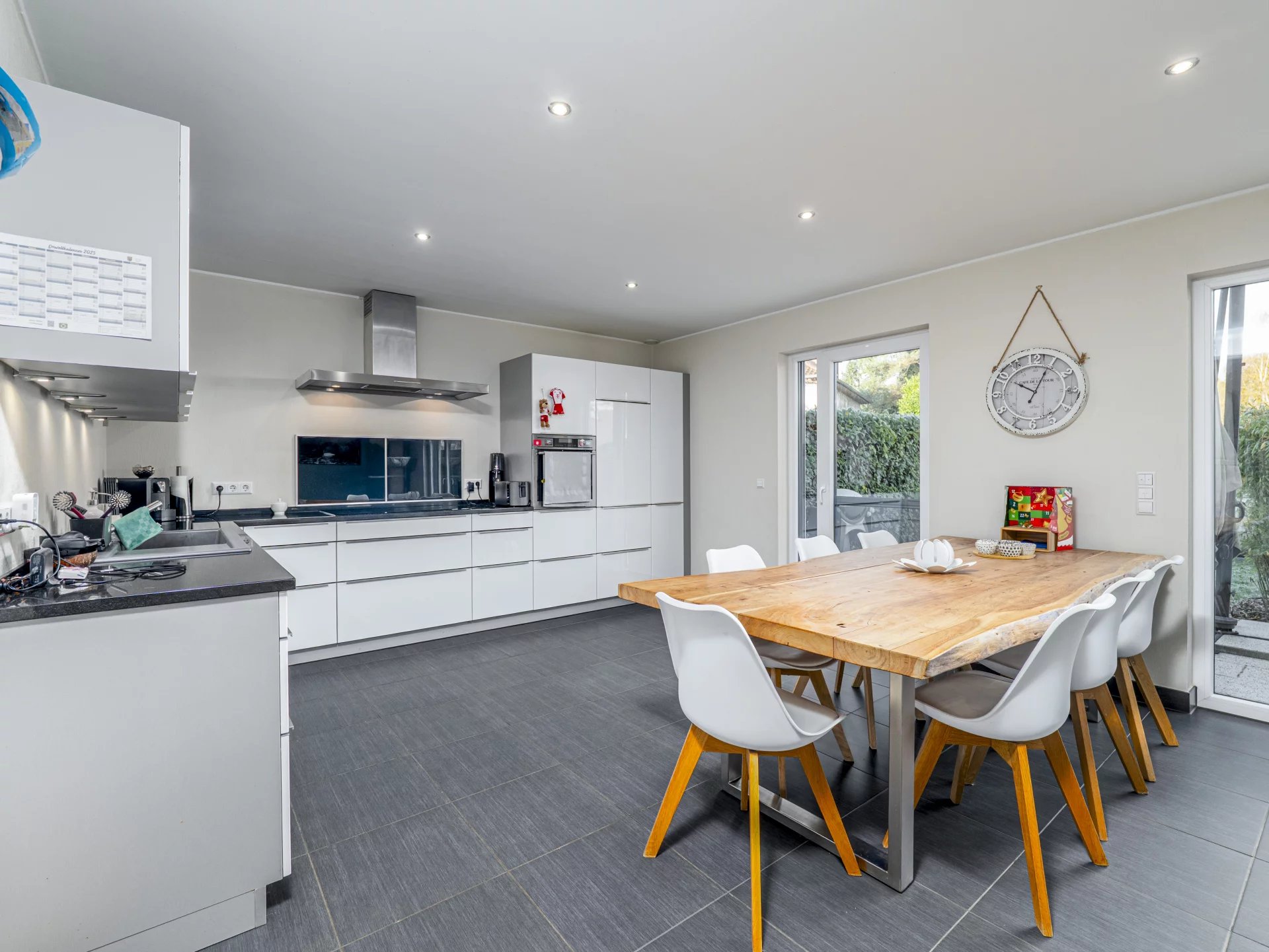 - Au rez-de-chaussée : un hall d'entrée, un garage avec buanderie et chaufferie, un WC séparé, un grand séjour avec cuisine équipée ouverte donnant accès à la terrasse et au jardin.