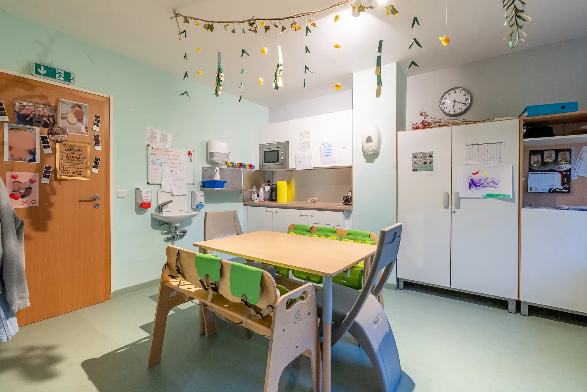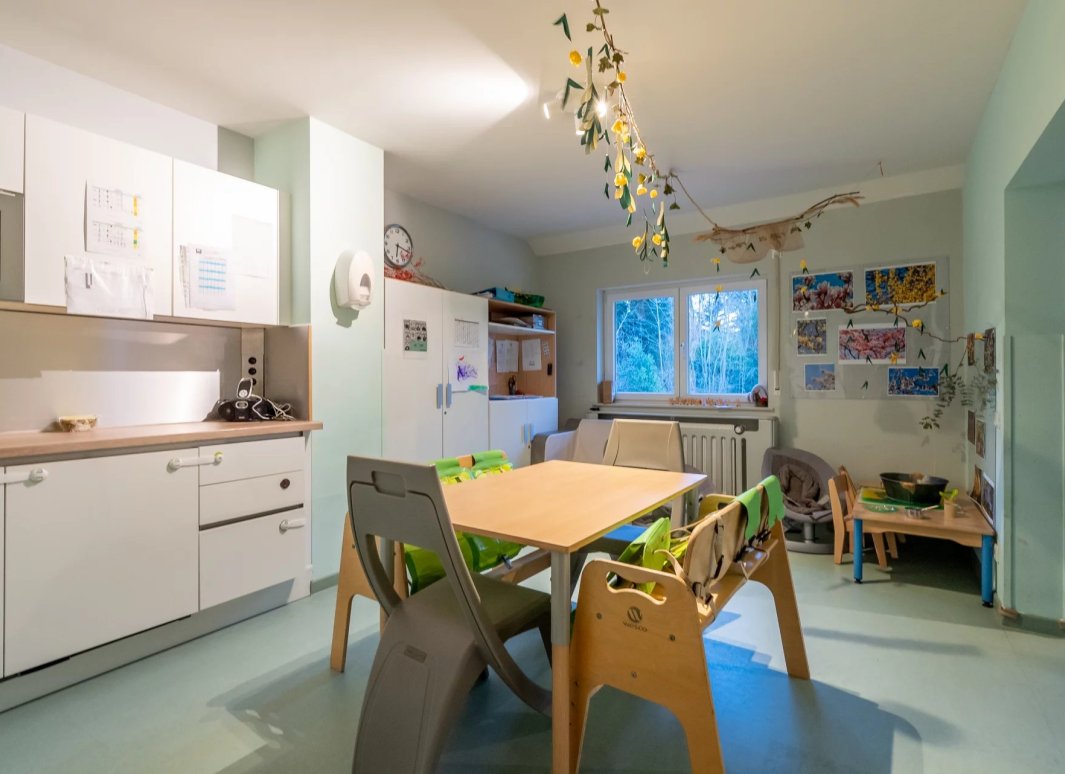 Différentes adaptations ont été faites dans l'immeuble d'habitation unifamilial pour permettre l'exploitation de l'immeuble en tant que crèche. Ainsi, des sanitaires adaptés en hauteur sont installés. Au dernier étage, dans la pièce du côté arrière, une porte qui fait la jonction avec l'immeuble voisin, a été réalisée et qui sert de sortie de secours.